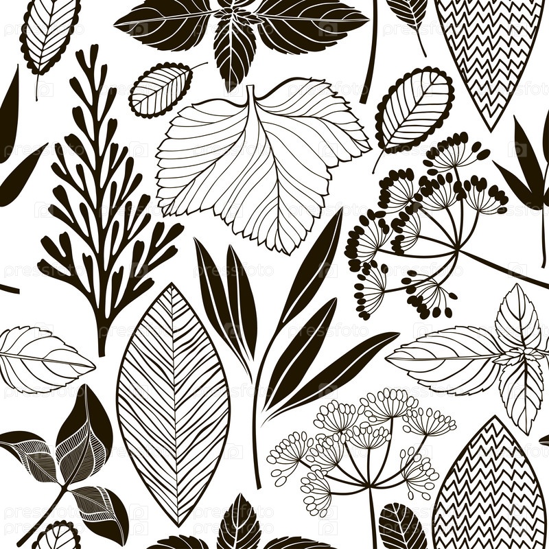 Абстрактный цветочный фон. Черно-белый векторный фон с различными растениями и листьями