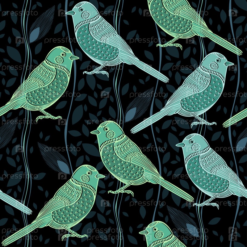 Цветочный бесшовный узор с птицами. Мультфильм Векторный фон