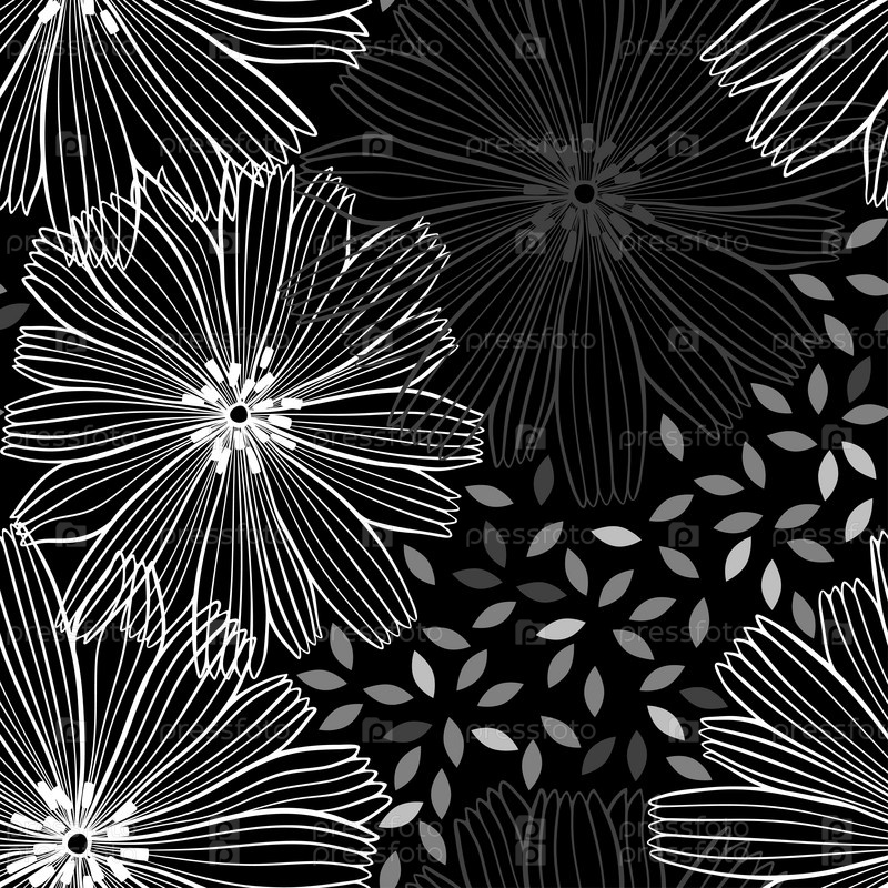 Монохромный бесшовный рисунок абстрактных цветов. Цветочные векторные иллюстрации на черном фоне