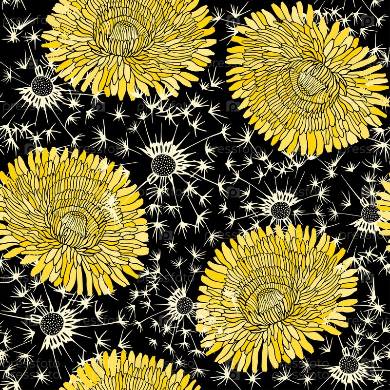 Бесшовный узор из одуванчиков. Ручной рисунок цветочного фона, векторная иллюстрация