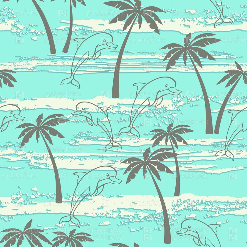 Бесшовный рисунок с дельфинами и пальмами. Летний фон