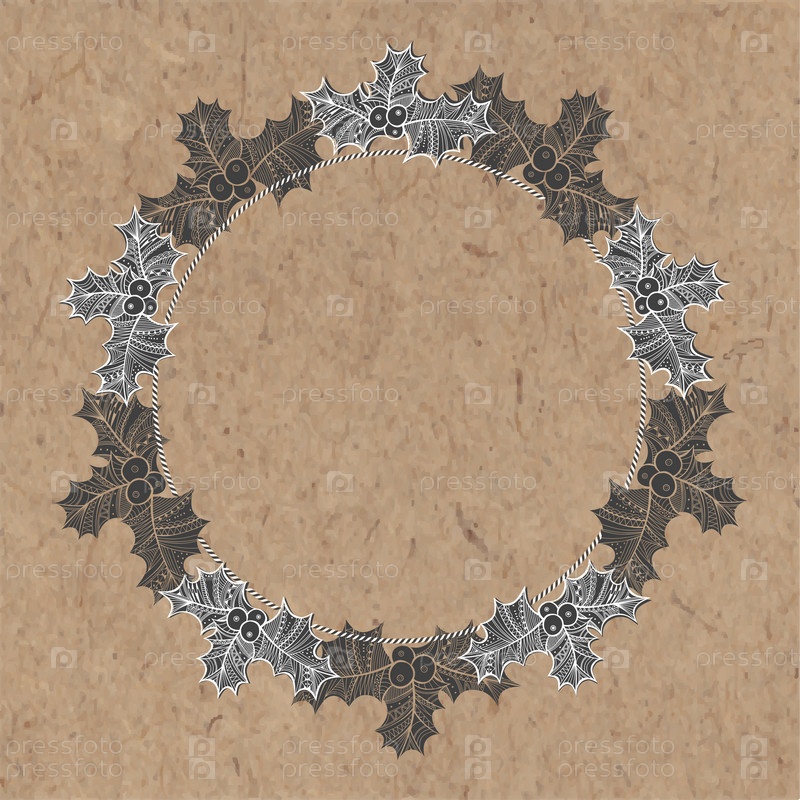 Новогодний фон с венком из остролиста на крафт-бумаге. Может быть открытка, приглашение, элемент дизайна