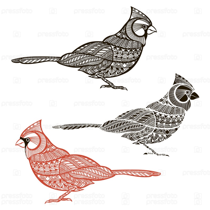Кардинал. Набор птиц, изолированные на белом фоне. Ручная рисованная векторная иллюстрация, эскиз. Элементы каракулей для дизайна
