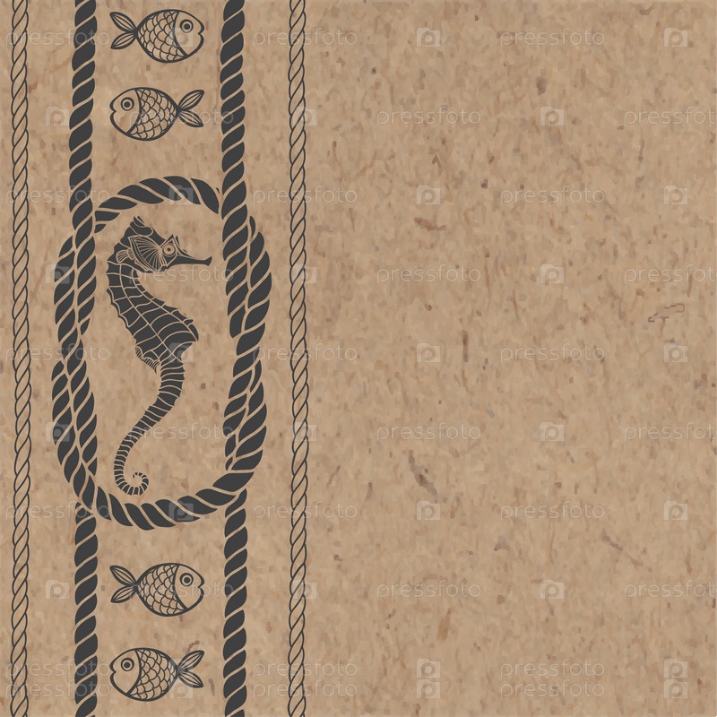 Морская карта с морскими узлами, веревками, морским коньком и рыбой на крафт-бумаге. Может быть открытка, приглашение, элемент дизайна