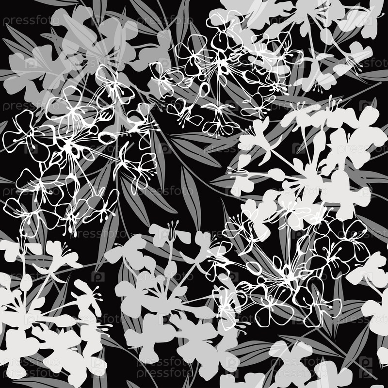 Монохромный бесшовный узор из абстрактных цветов и листьев. Ручной обращается цветочный фон