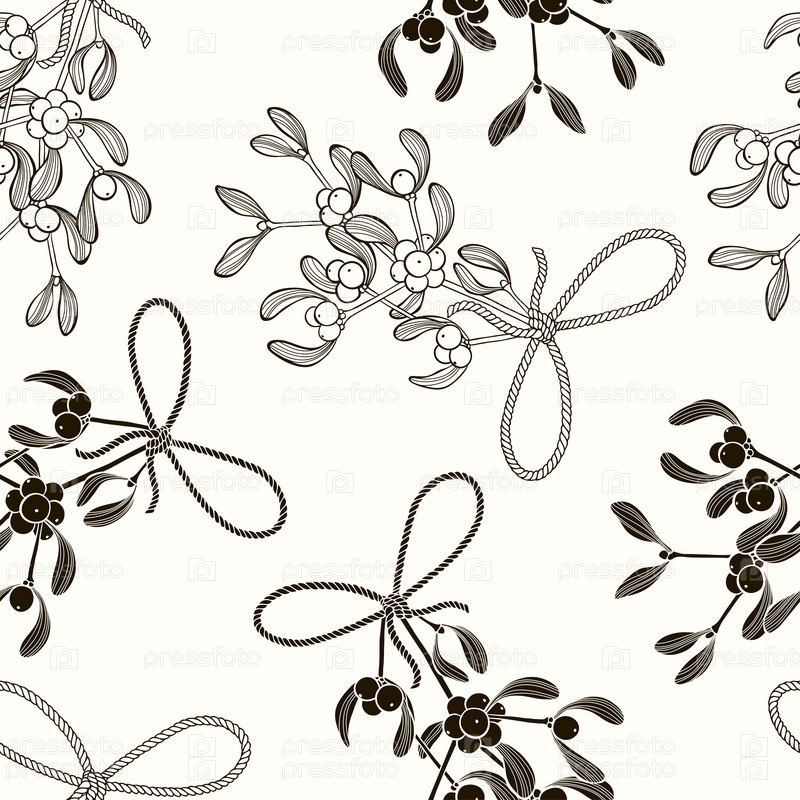 Бесшовный рисунок с омелой. Черно-белый векторный фон