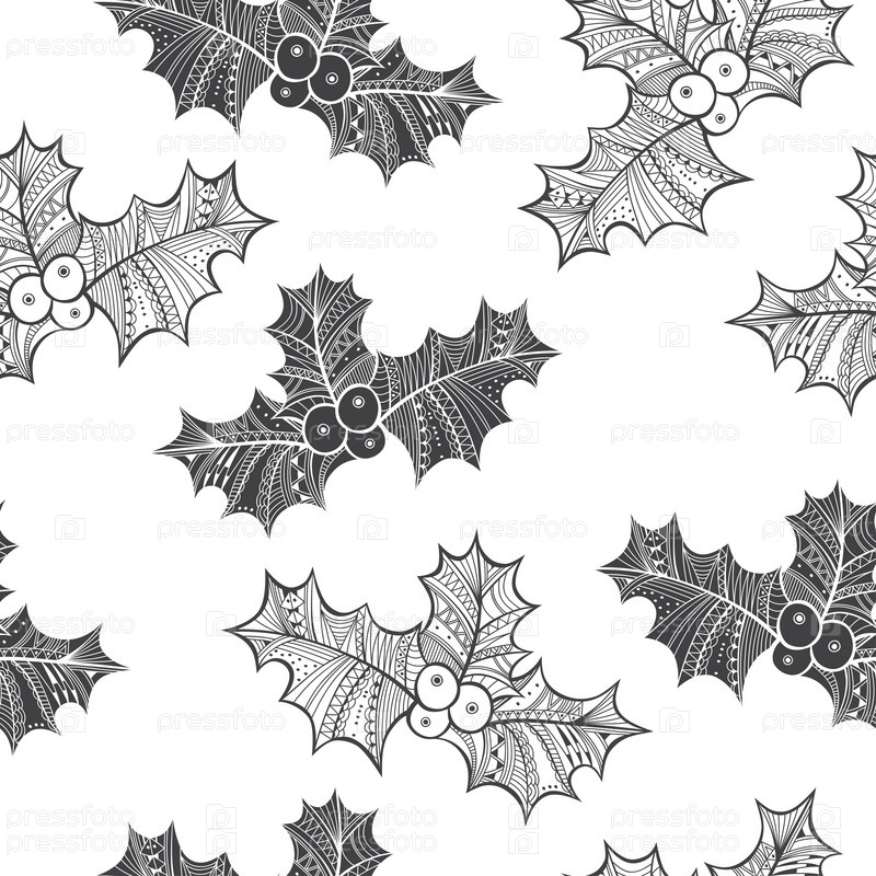 Черно-белый бесшовный рисунок с ягодой падуба. Рождественский фон каракули