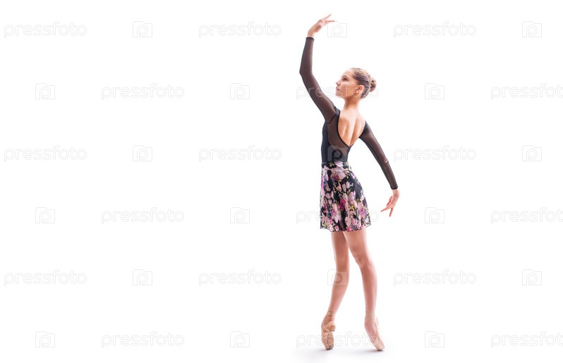 Молодая балерина в пуантах позирует в изящной позе на белом фоне