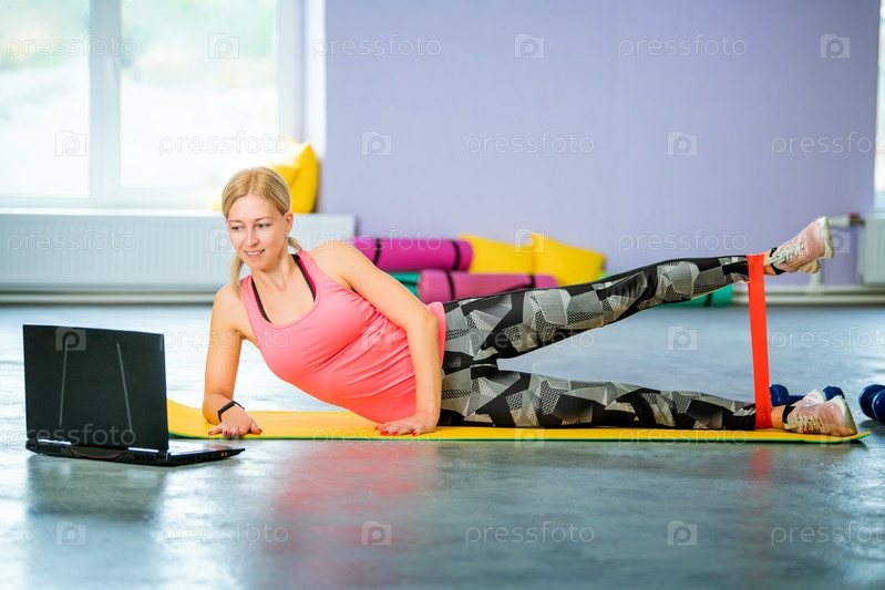 Спортивная женщина-тренер в одиночку ведет тренировку онлайн перед ноутбуком