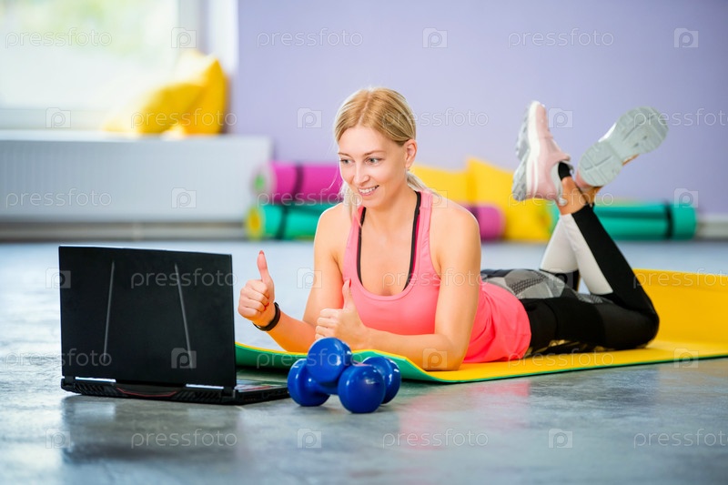 Молодая женщина-тренер проводит тренировку онлайн перед ноутбуком в тренажерном зале