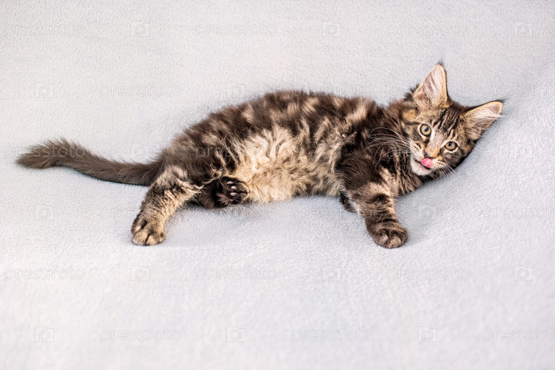 Табби котенок Мейн Кун лежит на легком пушистом одеяле