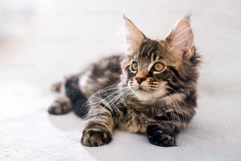 Табби котенок Мейн Кун лежит на легком пушистом одеяле