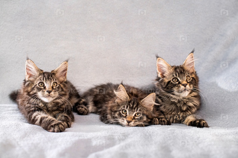 Семья мейнкунов, три котенка, лежат на легком пушистом одеяле