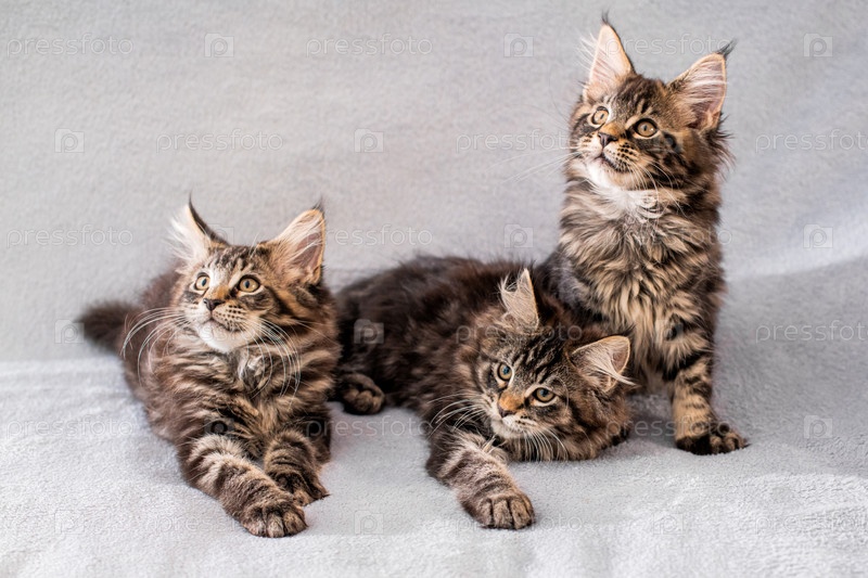 Семья мейнкунов, три котенка, лежат на легком пушистом одеяле