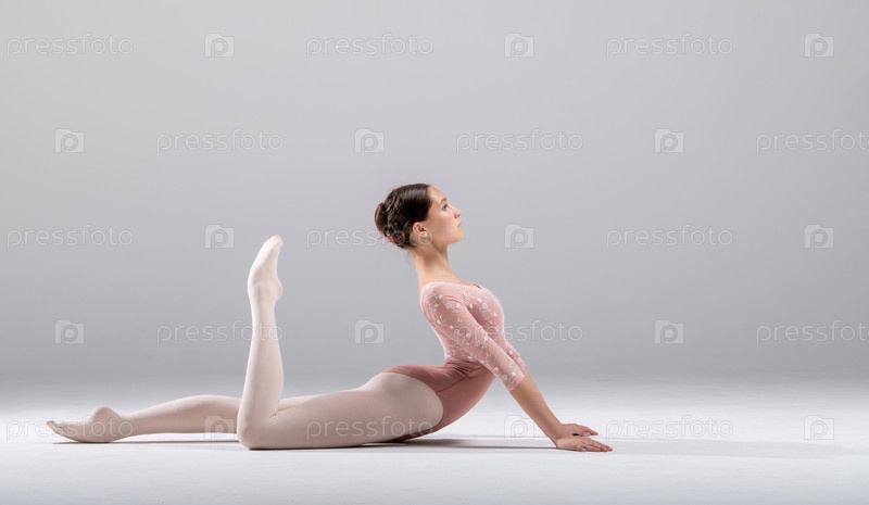 Красивая балерина на белом фоне одета в светло-розовый кружевной купальник, розовые купальники, занимается наземной гимнастикой на полу на белом фоне
