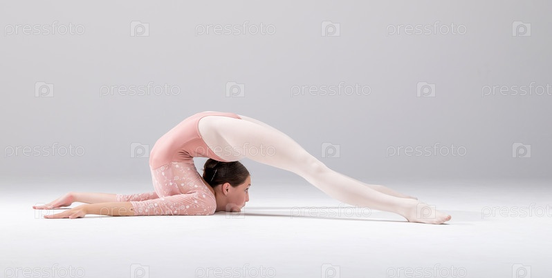 Красивая балерина на белом фоне одета в светло-розовый кружевной купальник, розовые купальники, занимается наземной гимнастикой на полу на белом фоне