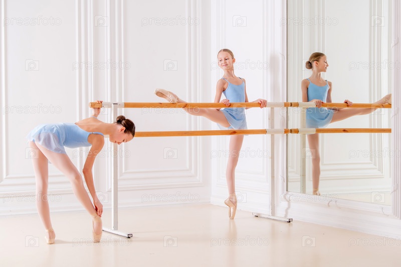 Молодые балерины репетируют в студии. Ряд счастливых молодых балерин, тренирующихся у балетного станка, сосредотачиваются на первой девушке