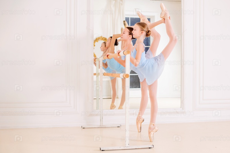 Молодые балерины репетируют в студии. Ряд счастливых молодых балерин, тренирующихся у балетного станка, сосредотачиваются на первой девушке. Молодой прекрасный артист балета