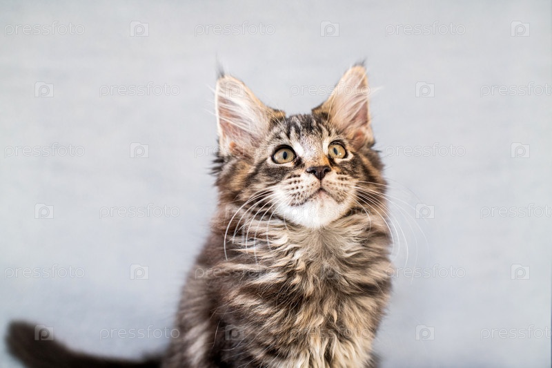 Табби котенок Мейн Кун лежит на легком пушистом одеяле