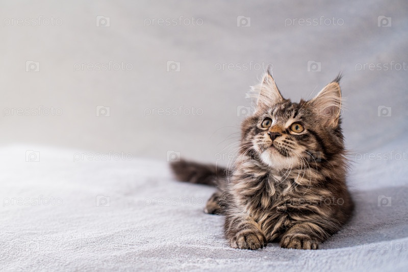 Табби котенок Мейн Кун лежит на легком пушистом одеяле