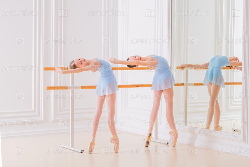 Молодые балерины репетируют в студии. Ряд счастливых молодых балерин, тренирующихся у балетного станка, сосредотачиваются на первой девушке. Молодой прекрасный артист балета