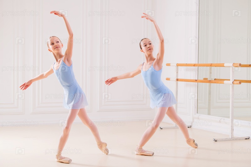 Молодые балерины репетируют в студии. Ряд счастливых молодых балерин, тренирующихся у балетного станка, сосредотачиваются на первой девушке. Молодой прекрасный артист балета