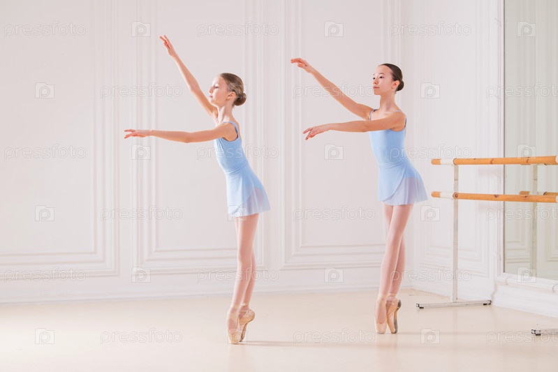 Молодые балерины репетируют в студии. Ряд счастливых молодых балерин, тренирующихся у балетного станка, сосредотачиваются на первой девушке. Молодой прекрасный артист балета