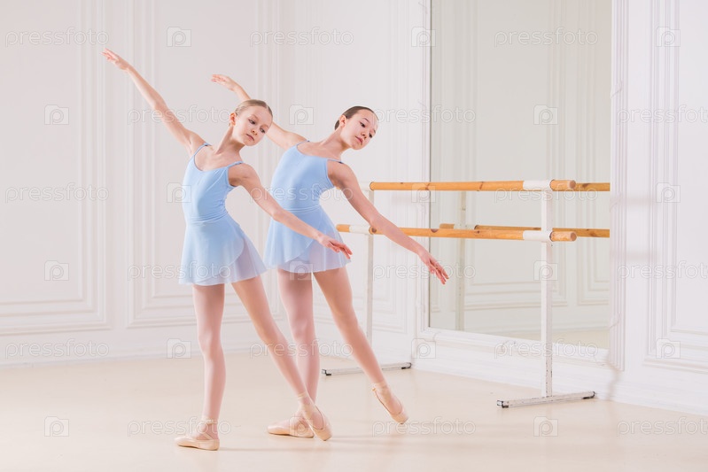 Молодые балерины репетируют в студии. Ряд счастливых молодых балерин, тренирующихся у балетного станка, сосредотачиваются на первой девушке. Молодой прекрасный артист балета