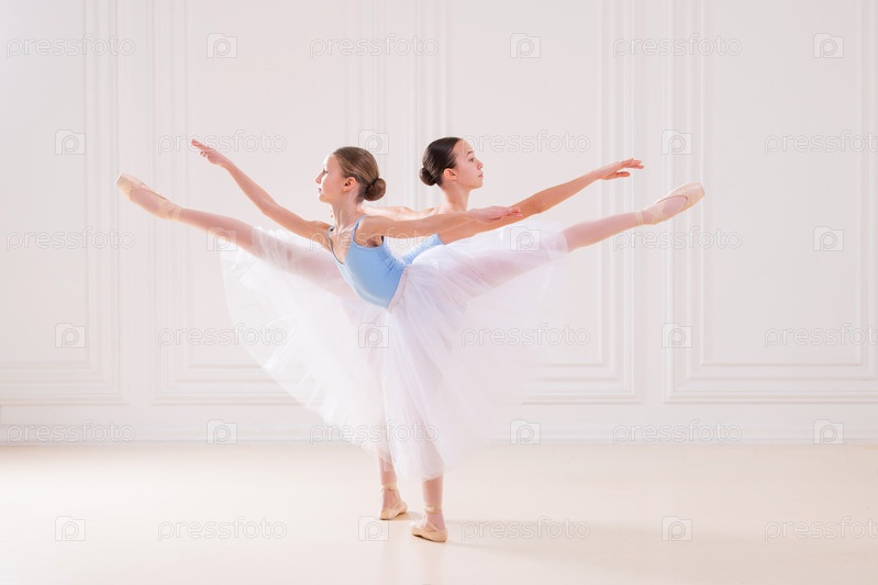 Молодые балерины репетируют в студии. Ряд счастливых молодых балерин, тренирующихся у балетного станка, сосредотачиваются на первой девушке. Молодой прекрасный артист балета