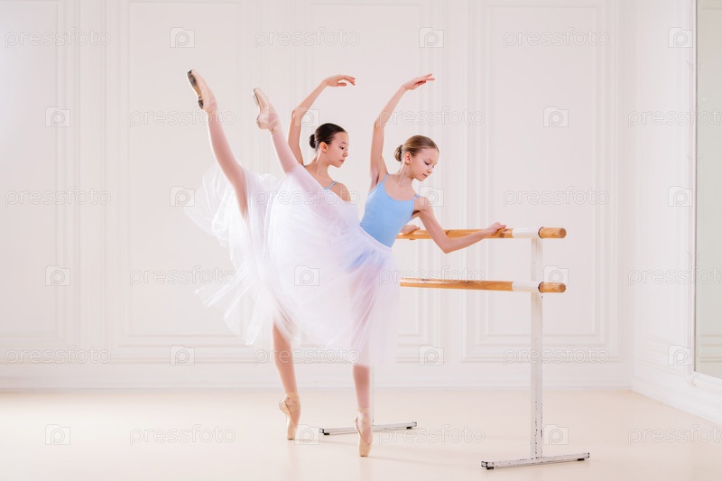 Молодые балерины репетируют в студии. Ряд счастливых молодых балерин, тренирующихся у балетного станка, сосредотачиваются на первой девушке. Молодой прекрасный артист балета