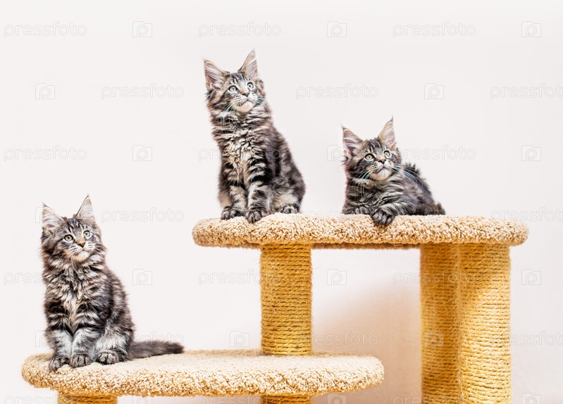 Три котенка мейн-куна с длинным пушистым хвостом сидят на когтеточке у светлой стены