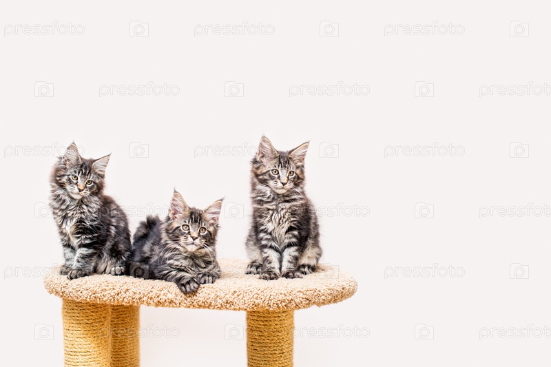 Три котенка мейн-куна с длинным пушистым хвостом сидят на когтеточке у светлой стены