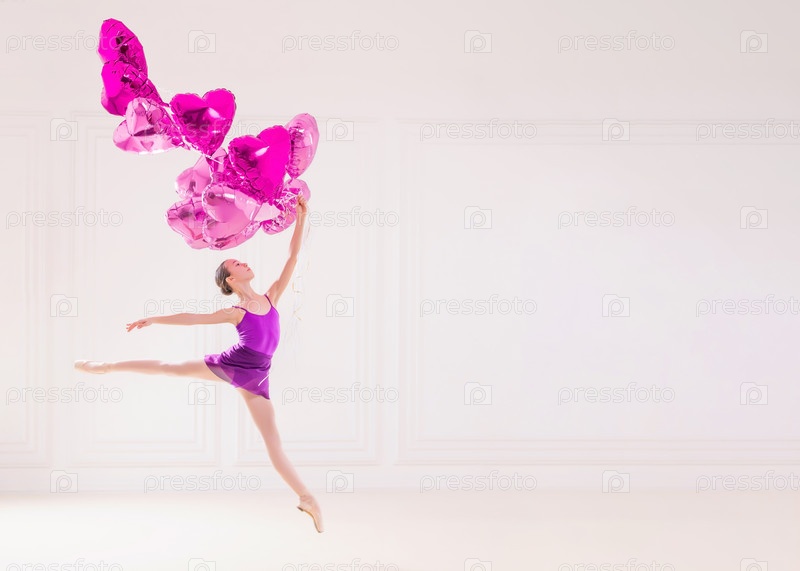 Студентка-балерина в сиреневом купальнике летит с кучей розовых воздушных шаров в форме сердца в красивой белой комнате