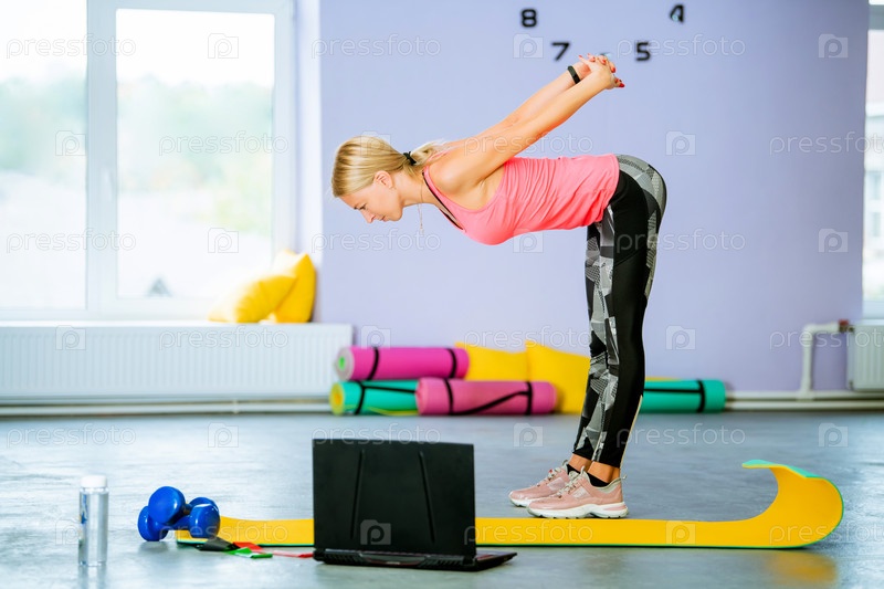 Спортивная женщина-тренер в одиночку ведет тренировку онлайн перед ноутбуком