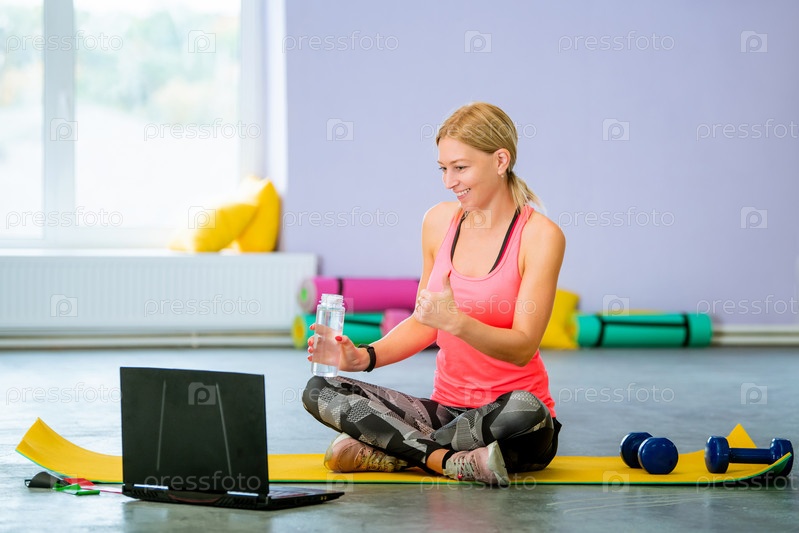Красивая спортсменка тренируется в зале онлайн перед ноутбуком
