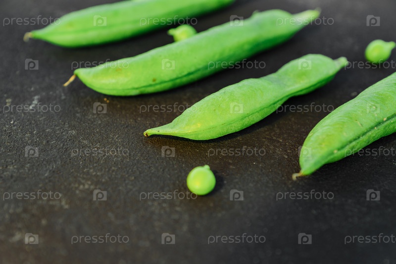 Крупный план свежего спелого зеленого горошка на черном фоне. Здоровая органическая пища