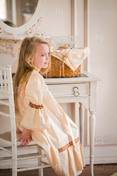 Маленькая девочка в винтажном домашнем платье рядом с корзиной с клубками пряжи