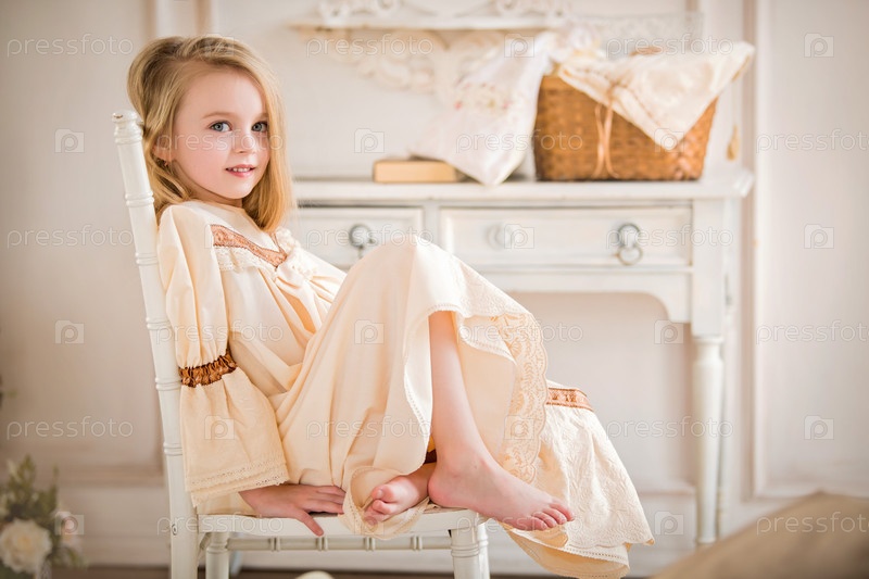 Портрет маленькой девочки в винтажном платье в светлом интерьере рядом с пряжей и инструментами для рукоделия