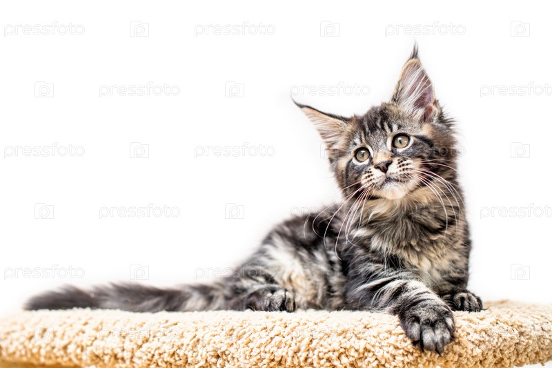 Полосатый котенок мейн кун лежит на когтеточке на белом фоне