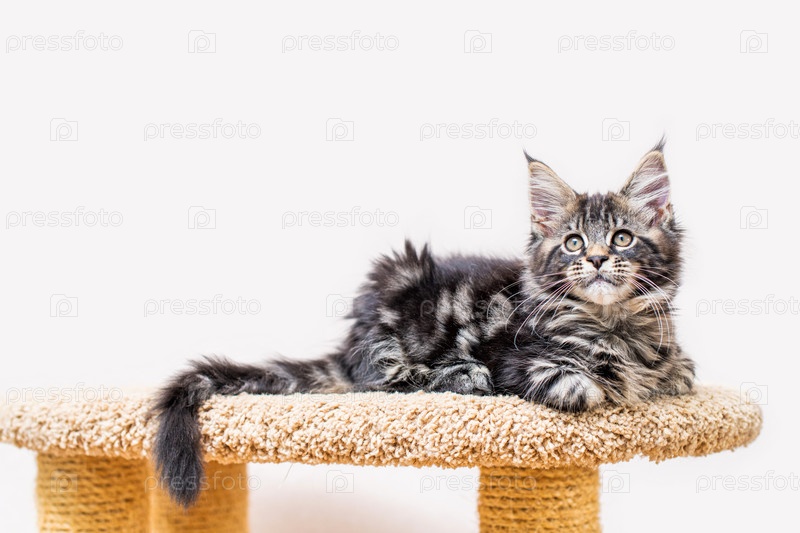 Котенок мейн-кун с длинным пушистым хвостом сидит на когтеточке у светлой стены