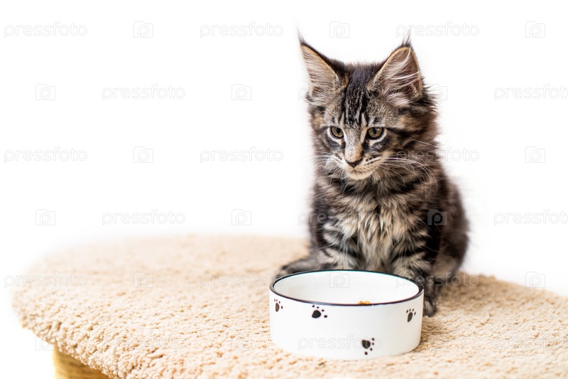 Полосатый серый котенок Мейн Кун сидит перед миской с едой
