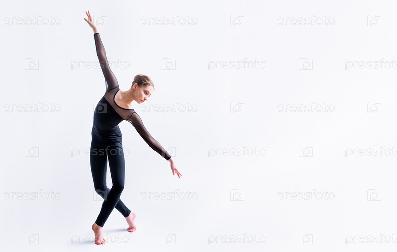 Балетная девушка в черном облегающем костюме танцует на белом фоне с современной современной хореографией
