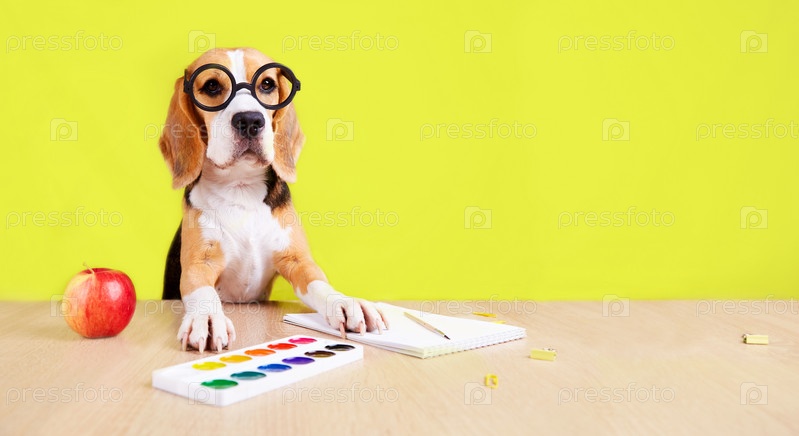 Собака-бигль в круглых очках сидит за партой со школьными принадлежностями