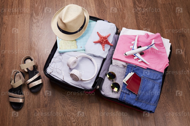 Открытый чемодан с женскими вещами, паспортом и аксессуарами для отпуска