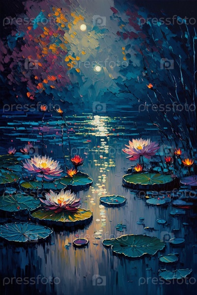 Ночной пруд с лотосами со светящимися лепестками мастихин текстура ночной пруд с лотосами