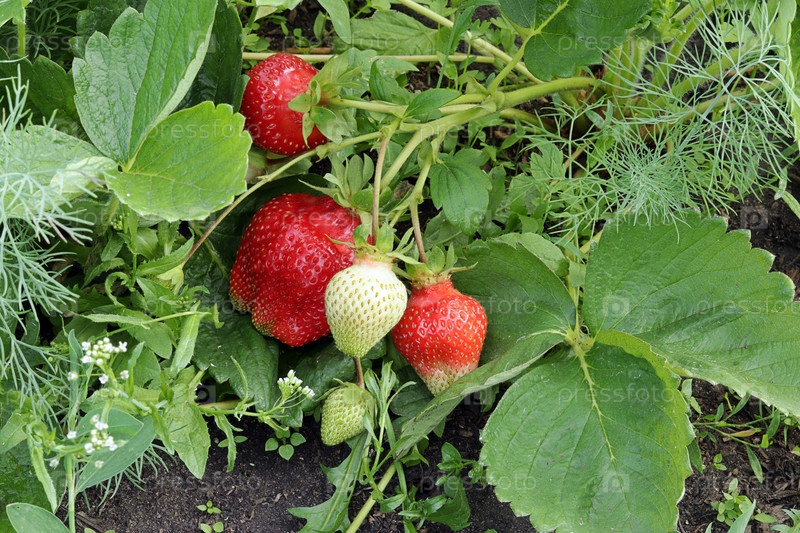 Спелая, сочная клубника растет и спеет в саду