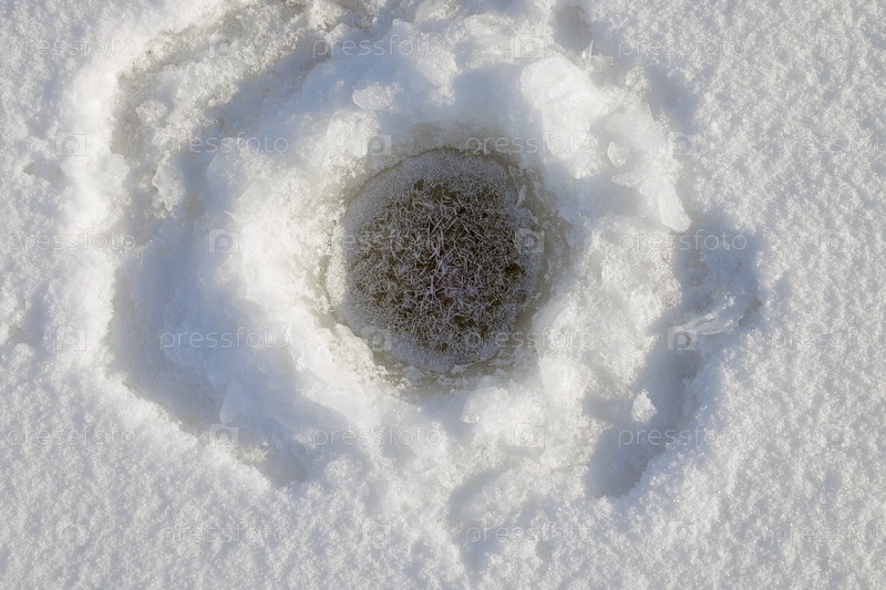 Зимняя подледная рыбалка. замерзшая лунка во льду для рыбалки зимой