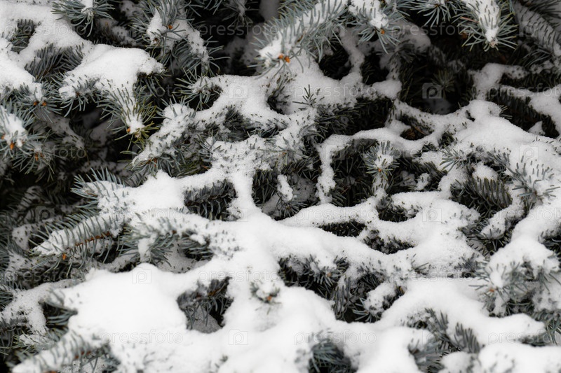 Первый снег на еловой ветке крупным планом. снежные шапки на ветвях ели. новогодний фон для дизайна