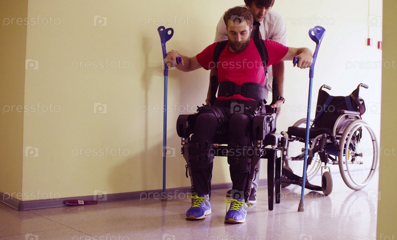 Молодой инвалид в роботизированном экзоскелете