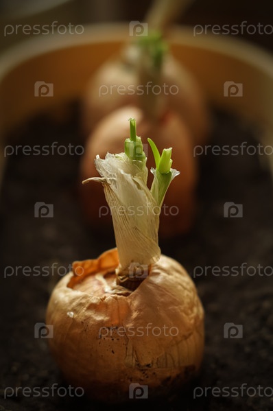 Крупный план проросшего лука в горшке на подоконнике. Сосредоточение внимания на перьях зеленого лука